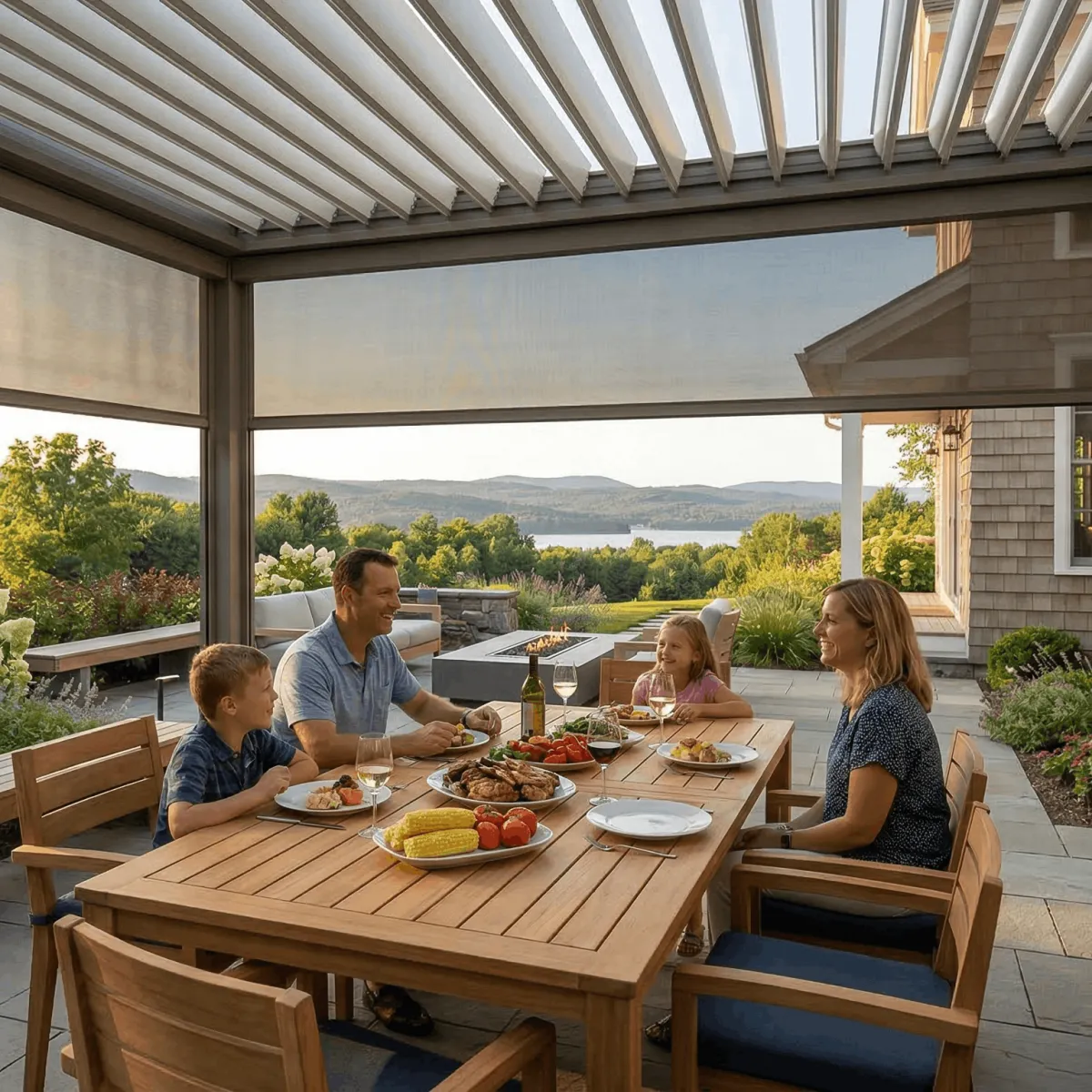 Home by 6:30 on a Tuesday in August. Screens down, pergola adjusted, dinner outside — without planning, without checking the forecast, without anyone suggesting you go in. October in Bethlehem with the leaves turning and the heat on and the season still going.