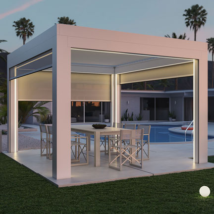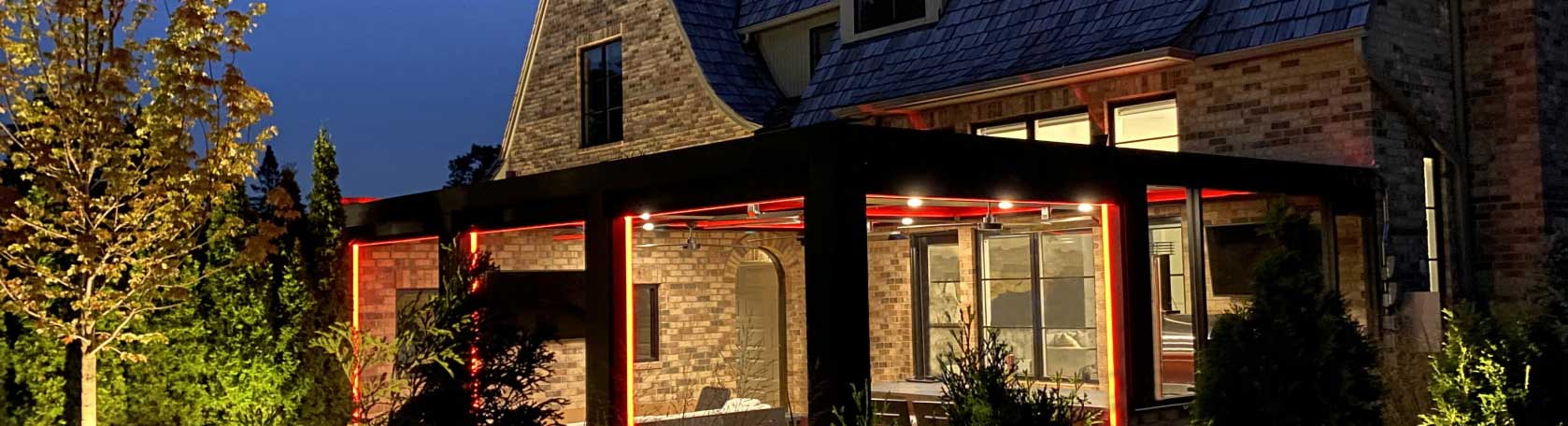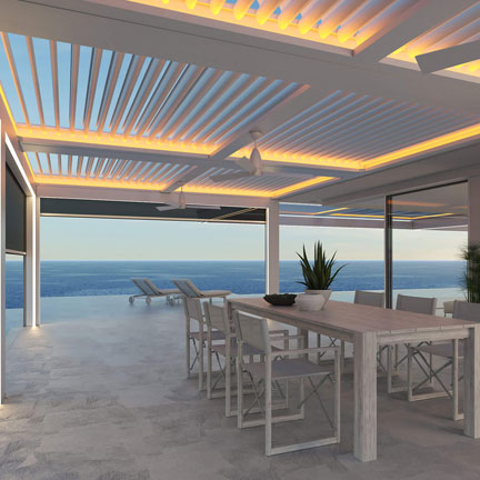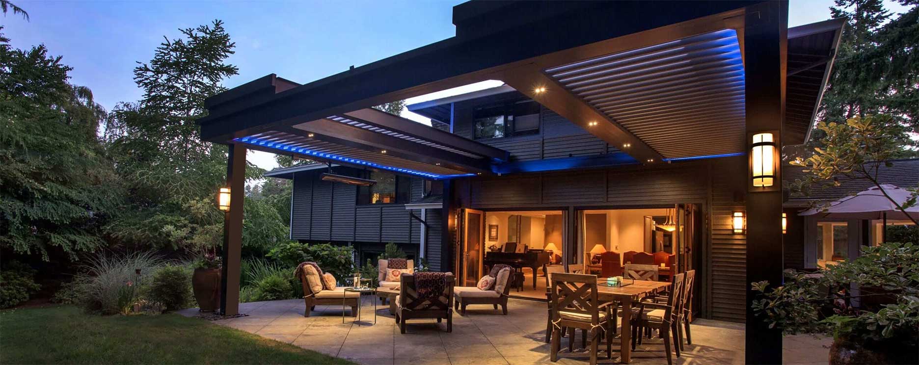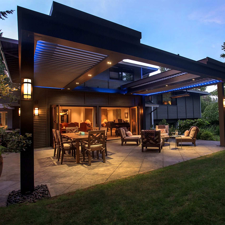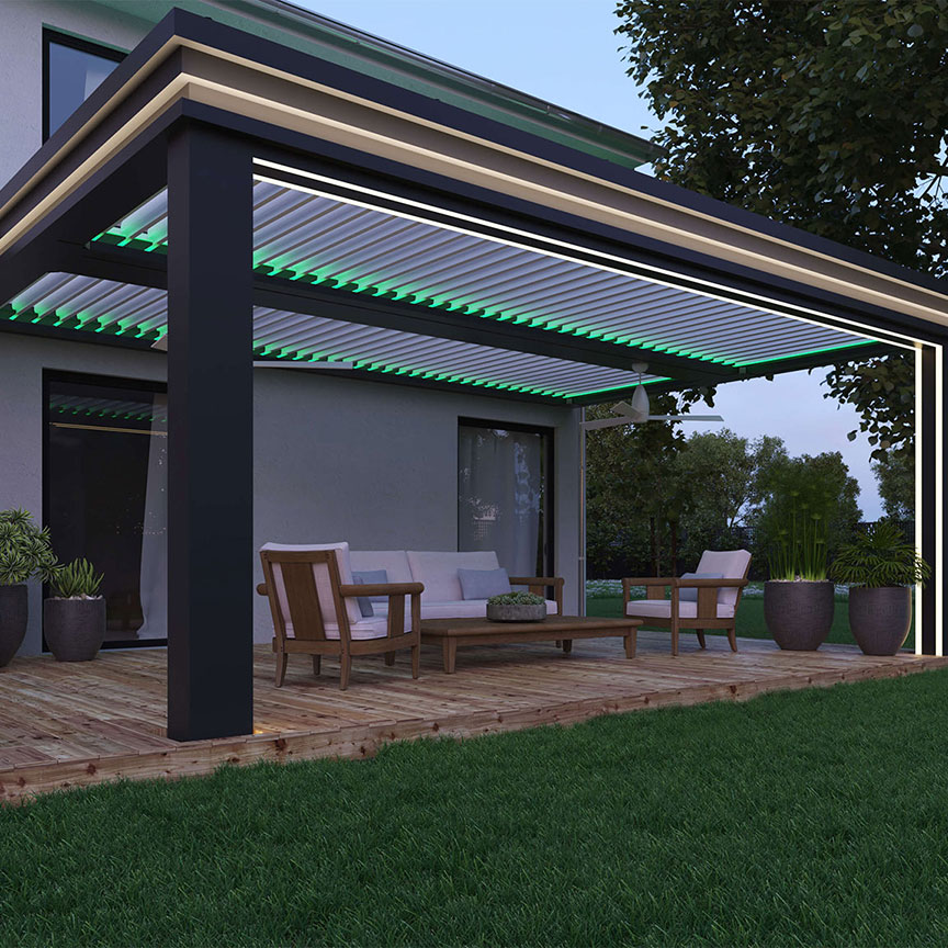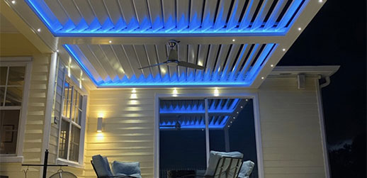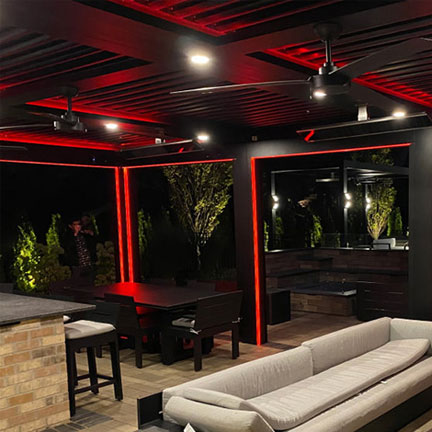 LED strip lighting built directly into the StruXure pergola frame channels — warm ambient light that runs the length of every beam without a single visible fixture. The wiring is concealed inside the TraX channel. Guests see the glow, not the hardware. Controlled from the StruXure app alongside your louvers and screens.