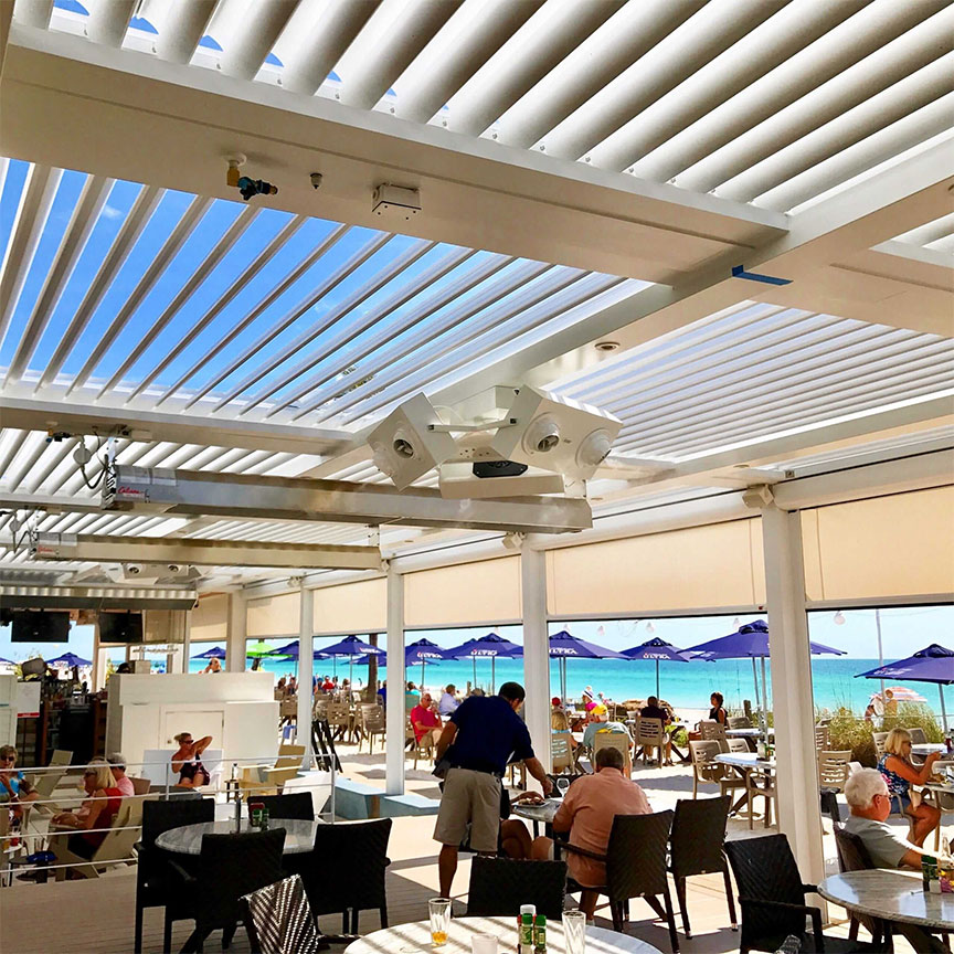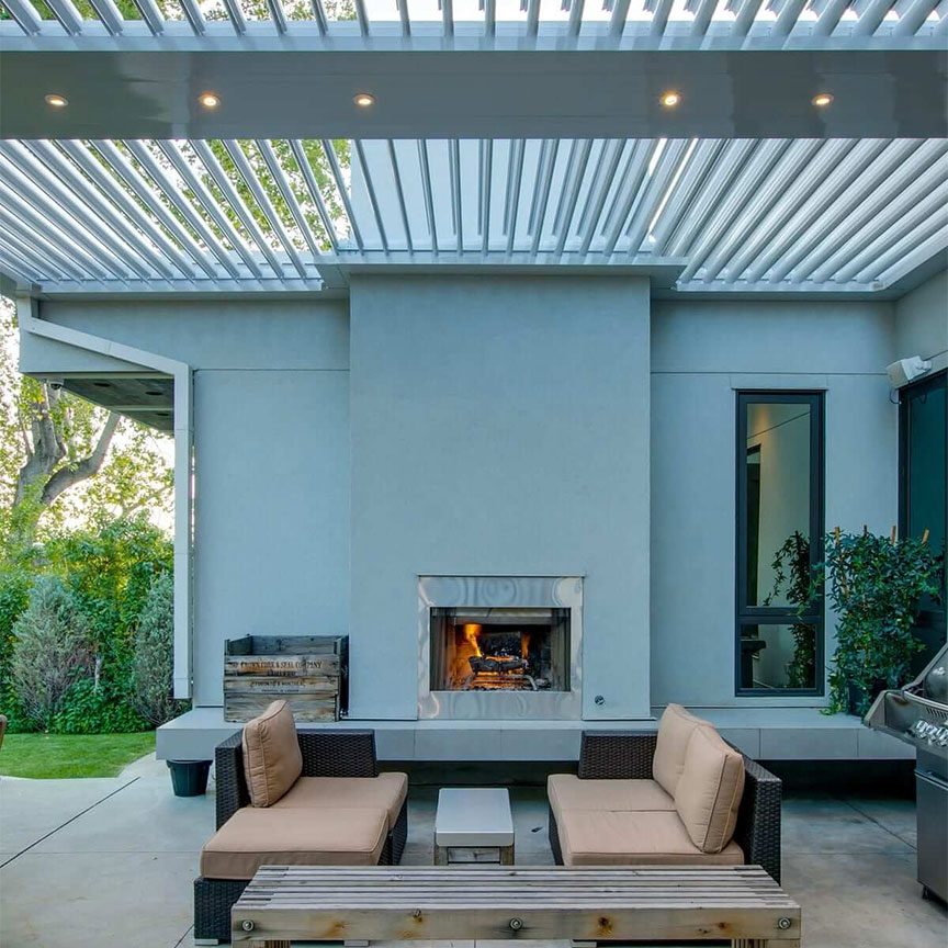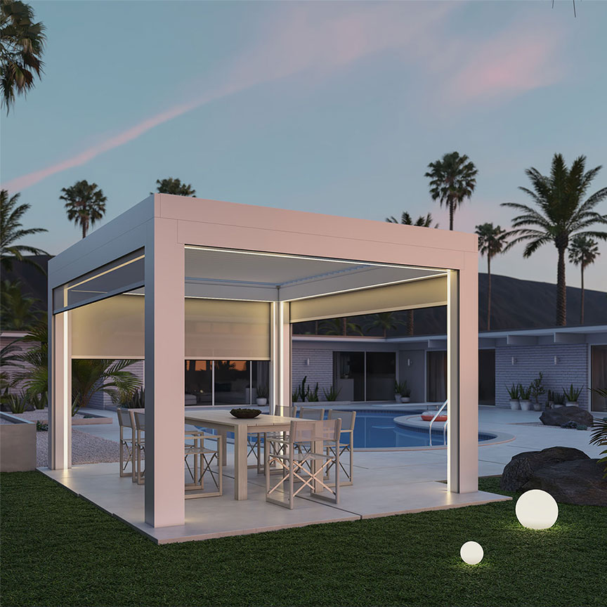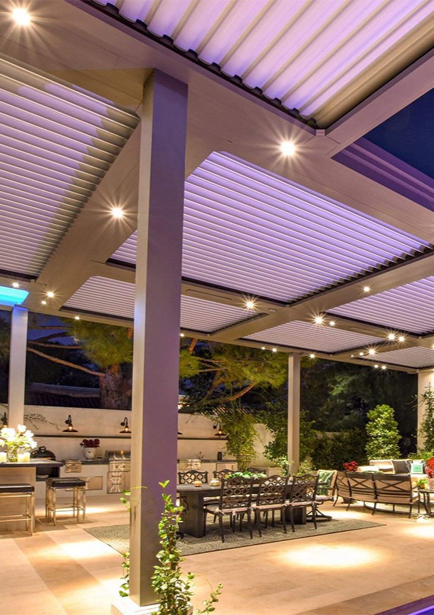 Alexa and Google Home integration is built in. Tell the pergola to close the louvers, drop the screens, or dim the lights. Or set it up so your system adjusts automatically — screens down at sunset, lights up at dusk, louvers closed when the wind sensor triggers. The pergola runs itself.