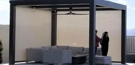 Motorized Fenetex screens deploy from the pergola's TraX channel rails — descending between posts to enclose the space on any or all sides in seconds. Bug-free in July. Rain-protected in a September storm. Retracted and invisible when you do not need them. Controlled from the same app, the same remote, or your voice.