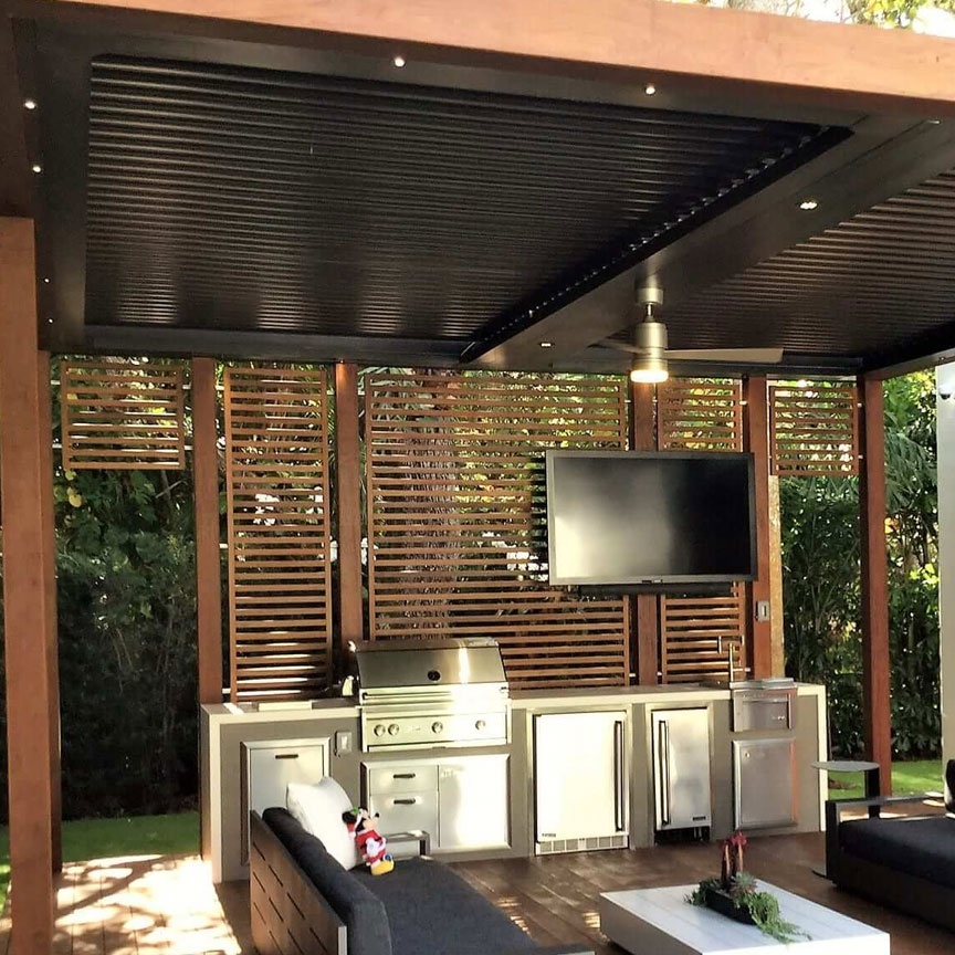 We specify every component — LED zones, screen sides, fan position, audio layout — and provide a fixed-price quote covering all hardware, electrical, and installation. Where applicable, we coordinate with the StruXure pergola build timeline so everything installs together. No surprises.