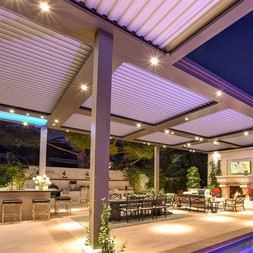 Integrated LED lighting. Motorized drop screens. A ceiling fan that actually moves air. Outdoor audio that actually sounds good.