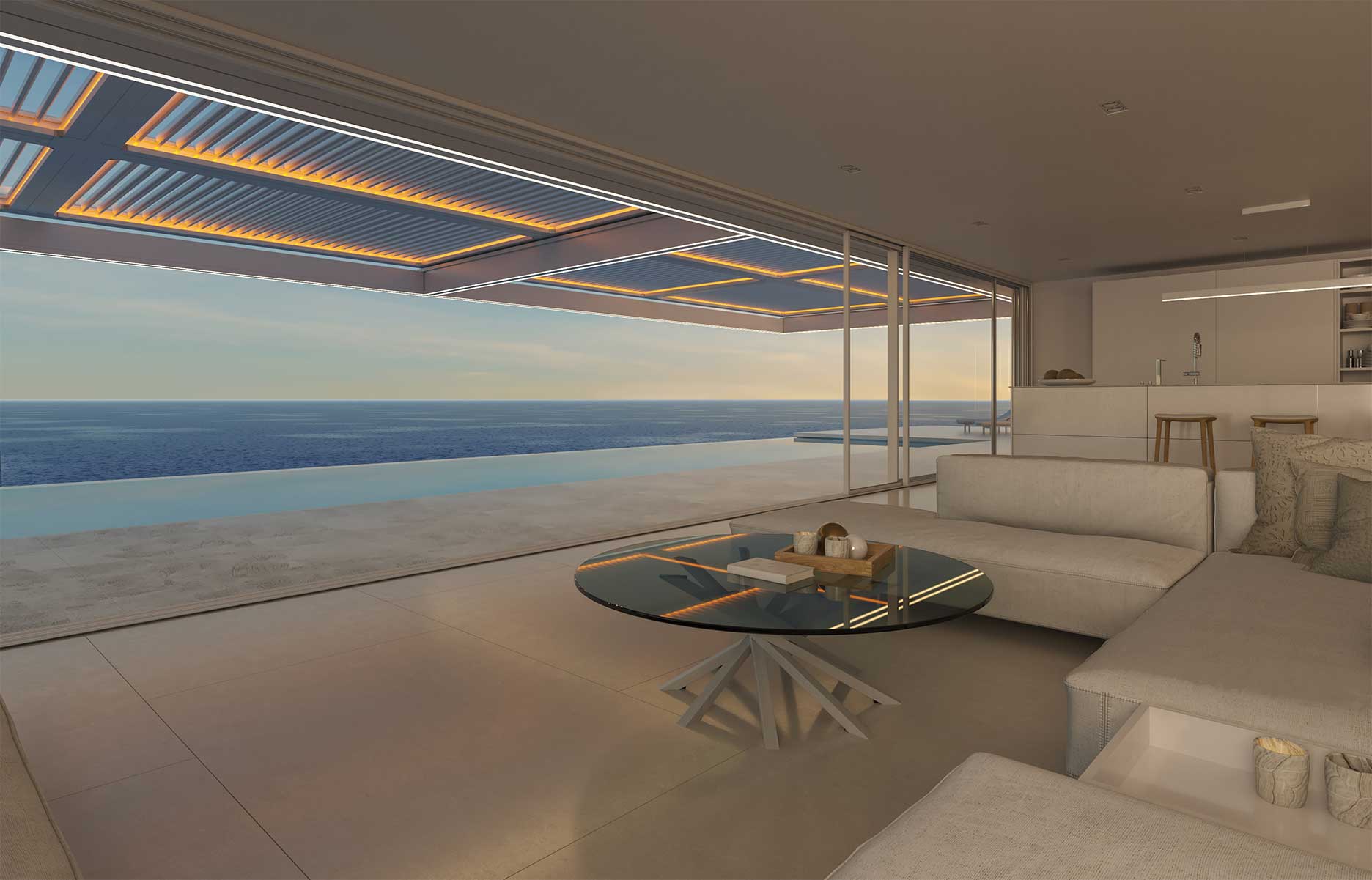 The LED wiring runs inside the beam. Nothing is visible when retracted or inactive. The result is a pergola that looks clean and minimal — until you dim the lights and drop the screens and it reveals itself as a fully equipped outdoor room.