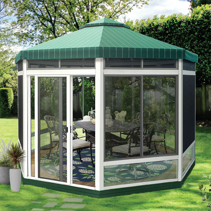 The roof structure incorporates vector venting that promotes natural airflow while maintaining structural integrity. The screen room stays cool in summer without trapping heat — which is the failure mode of cheaper enclosed structures that turn into ovens by July.